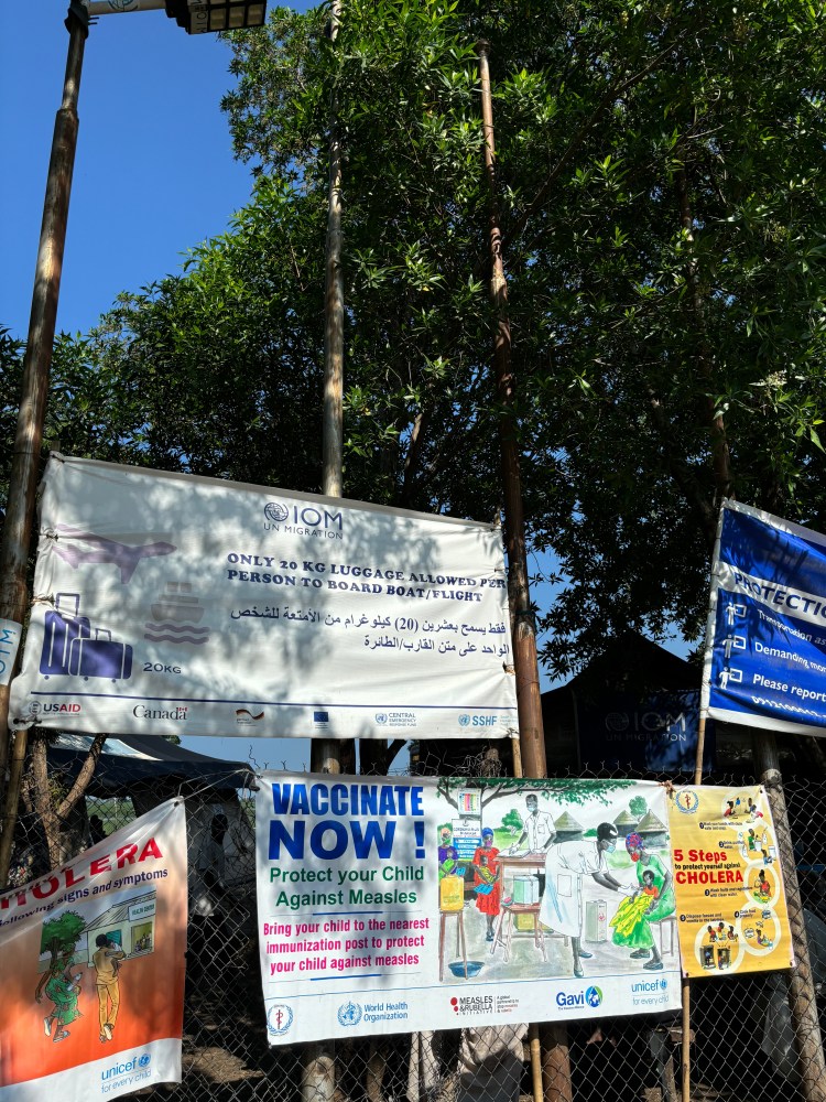 Signs at a transfer center for migrants fleeing Sudan in Malakal, South Sudan